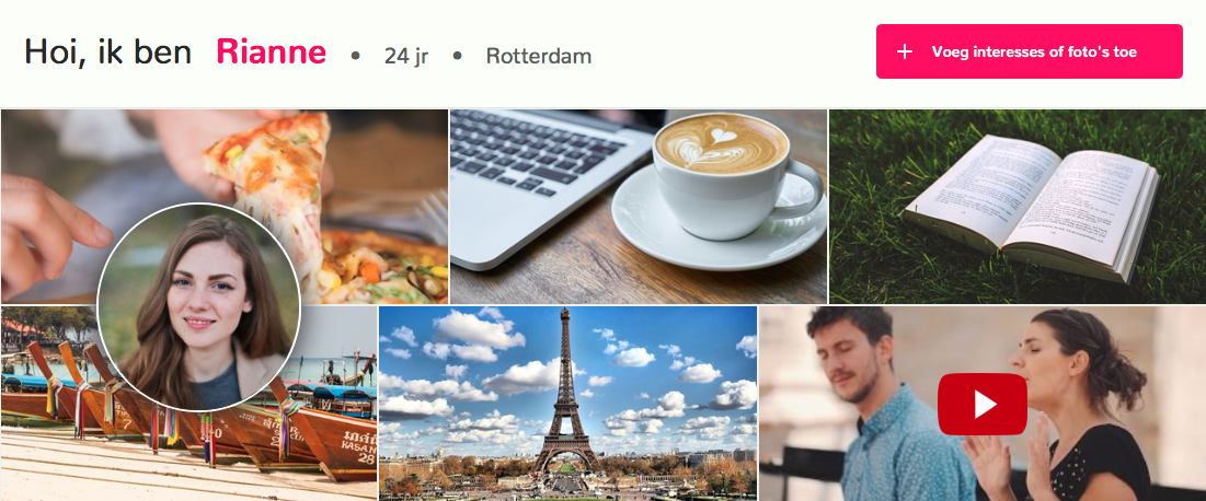 Je profiel bestaat voornamelijk uit foto’s en filmpjes. Hierdoor krijgt jouw potentiële date in één oogopslag een idee van wie jij bent en welke dingen je leuk en interessant vindt. Je kunt een toelichting geven bij het beeld dat je gekozen hebt.